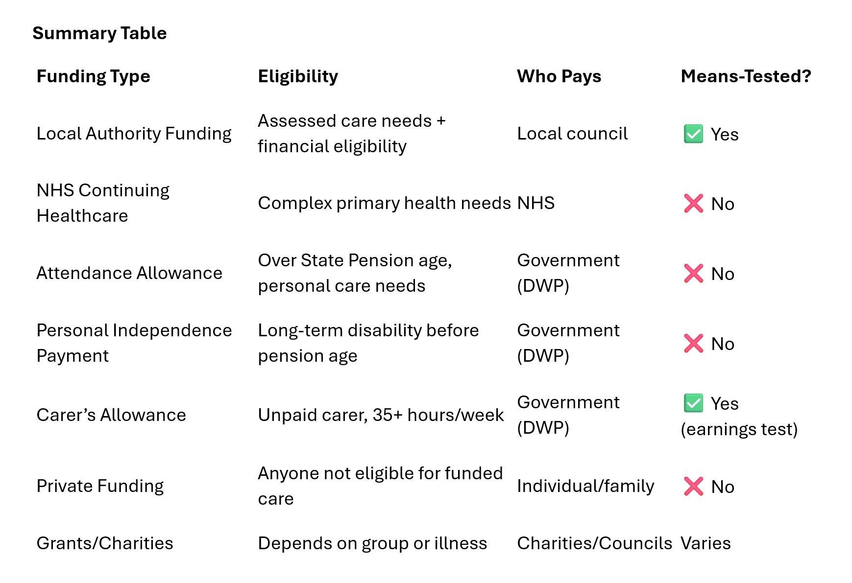 If the assessment concludes that you have eligible care needs, a financial assessment (means test) will determine whether you qualify for local authority funding.